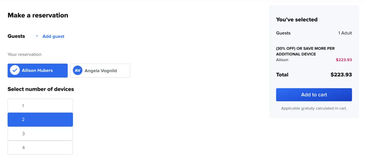 But, if one guest purchases a two-device package with the intent of sharing the login, the total cost comes down to $223.93.